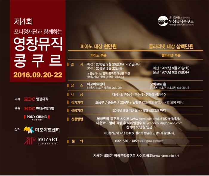 영창뮤직 현계흥 대표는 "영창뮤직콩쿠르는 상업적인 다른 콩쿨 행사와는 완전히 차별화된다"며 "한국과 중국의 반짝이는 젊은 음악 인재들을 발견하고, 개인역량과 재능을 펼칠 수 있도록 육성해 매년 가을 아시아 최대의 음악축제로 성장시킬 것"이라 말했다.'제4회 포니정재단과 함께하는 영창뮤직 콩쿠르' 개최를 알리는 포스터.<사진제공=영창뮤직>