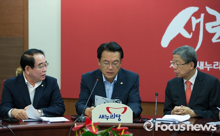 (서울=포커스뉴스) 8일 오전 서울 여의도 새누리당사에서 열린 마지막 혁신비상대책위원회의에서 김희옥(오른쪽부터) 혁신비대위원장, 정진석 원내대표, 박명재 사무총장이 의견을 나누고 있다.