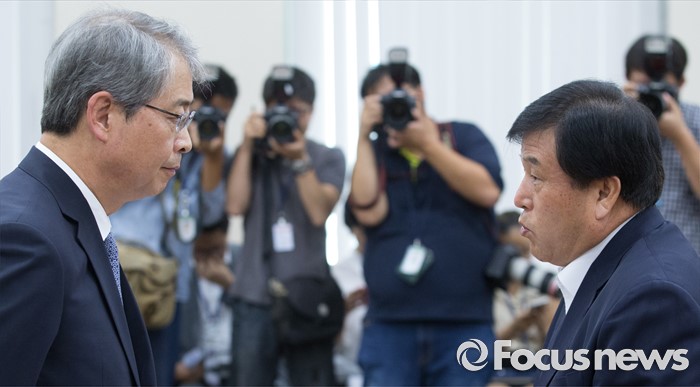 (서울=포커스뉴스) 8일 오전 서울 여의도 국회에서 열린 정무위원회 전체회의에 참석한 이진복(오른쪽) 위원장과 임종룡 금융위원장이 대화하고 있다.