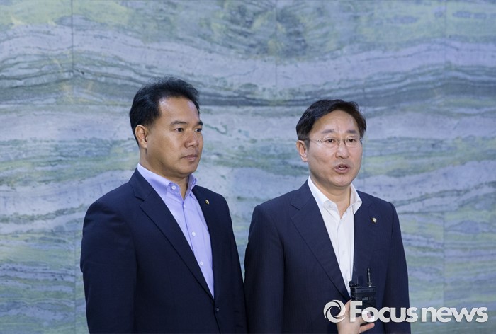 (서울=포커스뉴스) 8일 오전 서울 여의도 국회 의안과에서 박범계(오른쪽) 더불어민주당 의원과 이용주 국민의당 의원이 고위공직자비리수사처 설치 법안을 제출한 뒤 취재진 질문에 답하고 있다.