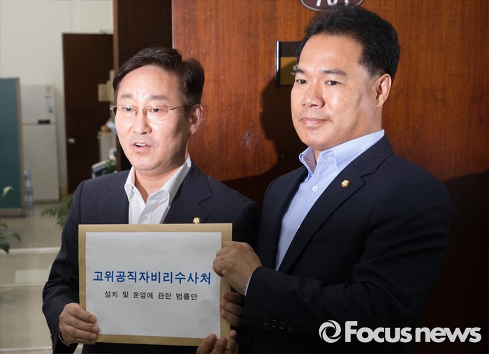 (서울=포커스뉴스) 8일 오전 서울 여의도 국회 의안과에서 박범계(왼쪽) 더불어민주당 의원과 이용주 국민의당 의원이 고위공직자비리수사처 설치 법안을 제출하고 있다.