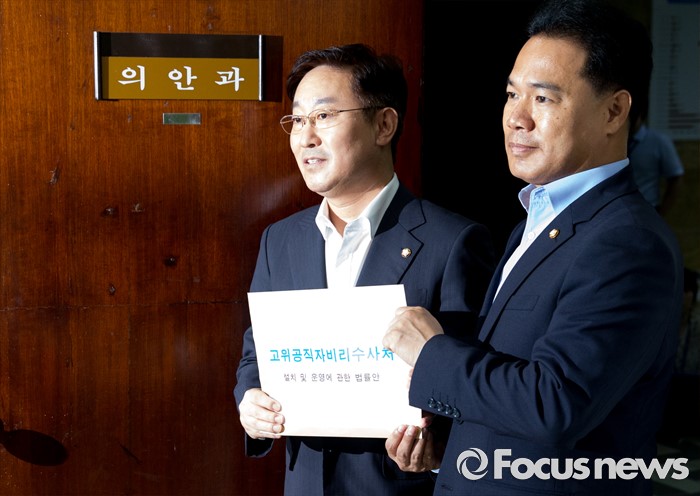 (서울=포커스뉴스) 8일 오전 서울 여의도 국회 의안과에서 박범계(왼쪽) 더불어민주당 의원과 이용주 국민의당 의원이 고위공직자비리수사처 설치 법안을 제출하고 있다.