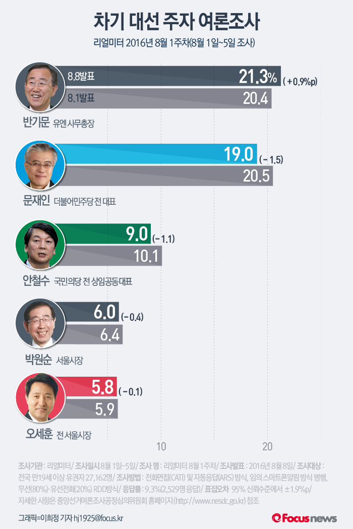 (서울=포커스뉴스) 8일 발표한 여론조사 기관 리얼미터 2016년 8월 1주차 주간집계에 따르면 차기 대선 주자 여론조사에서 반기문 유엔사무총장의 지지율은 2주 연속 상승한 반면, 문재인 더불어민주당 전 대표는 하락했다. 안철수 국민의당 전 대표는 작년 12월 1주차 이후 가장 낮은 지지율로 떨어졌다.
