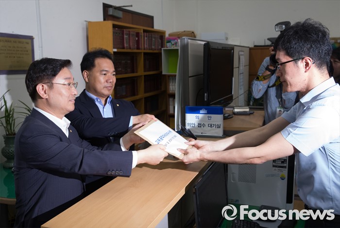 (서울=포커스뉴스) 8일 오전 서울 여의도 국회 의안과에서 박범계(왼쪽) 더불어민주당 의원과 이용주 국민의당 의원이 고위공직자비리수사처 설치 법안을 제출하고 있다.