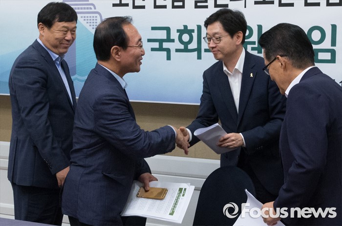 (서울=포커스뉴스) 8일 오전 서울 여의도 국회 귀빈식당에서 조선 산업 발전과 조선 산업 노동자의 고용 안정을 위한 국회의원 모임 발족 기자회견을 마친 의원들이 인사하고 있다. 왼쪽부터 김종훈 무소속 의원, 노회찬 정의당 원내대표, 김경수 더불어민주당 의원, 박지원 국민의당 비상대책위원장.