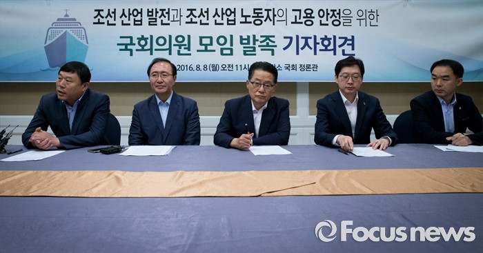 (서울=포커스뉴스) 8일 오전 서울 여의도 국회 귀빈식당에서 열린 조선 산업 발전과 조선 산업 노동자의 고용 안정을 위한 국회의원 모임 발족 기자회견에 참석한 의원들이 발언하고 있다. 왼쪽부터 김종훈 무소속 의원, 노회찬 정의당 원내대표, 박지원 국민의당 비상대책위원장, 김경수 더불어민주당 의원, 채이배 국민의당 의원.