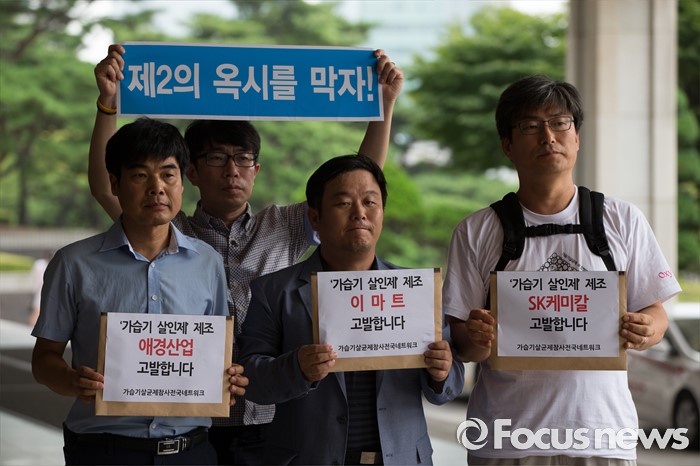 (서울=포커스뉴스) 8일 오전 서울 서초구 서울중앙지방검찰청 앞에서 가습기살균제참사전국네트워크 회원들이 SK케미칼, 애경산업, 이마트에 대한 수사를 촉구하며 3개사 전·현직 최고위 임원들에 대한 고발장을 제출하기 전 취재진에게 포즈를 취하고 있다.
