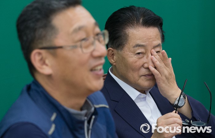 (서울=포커스뉴스) 박지원(오른쪽) 국민의당 비상대책위원장이 8일 오후 서울 여의도 국회에서 김주업 전국공무원노조 위원장 등 관계자들과 면담 중 얼굴을 만지고 있다.