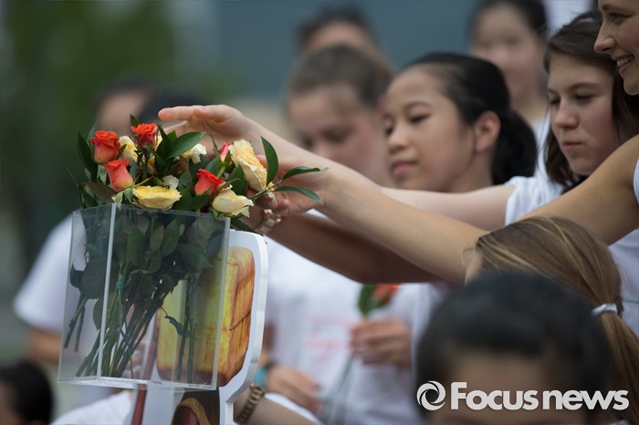 (서울=포커스뉴스) 8일 오전 서울 종로구 광화문광장에서 열린 '월드비전 2016세계어린이합창제' 런치콘서트에서 헝가리, 필리핀 어린이 합창단과 한국 월드비전 합창단이 합창을 마친 뒤 난민 아동들에게 희망을 선물한다는 의미로 꽃을 전달하는 퍼포먼스를 선보이고 있다. 올해로 6회를 맞은 '월드비전 2016 세계어린이합창제'는 'Song of Peace-평화의 노래'라는 주제로 8월 6일부터 11일까지 예술의 전당에서 열린다.