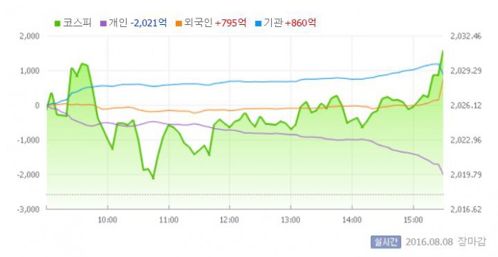 8일 코스피지수는 전거래일 대비 0.65%(13.18포인트) 오른 2031.12에 장을 마쳤다. 코스닥지수는 전거래일 보다 0.05%(0.34포인트) 상승한 696.43에 마감했다.