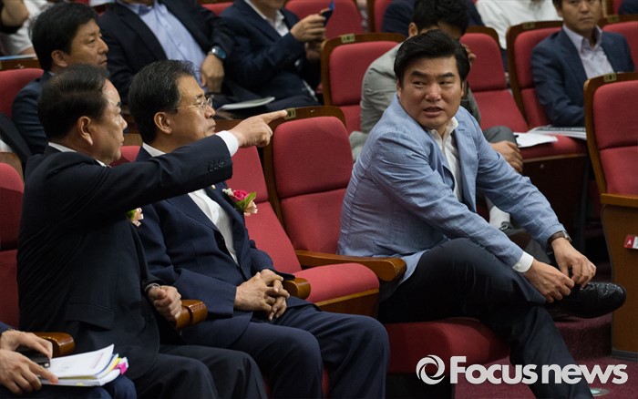 (서울=포커스뉴스) 원유철(오른쪽) 새누리당 의원이 8일 오후 서울 여의도 국회 의원회관에서 열린 공간정보 국외 반출 관련 정책 토론회에 참석해 이우현(왼쪽) 의원과 대화하던 중 신발끈을 묶고 있다.