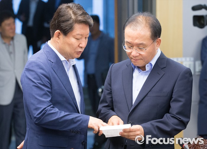 (서울=포커스뉴스) 8일 오후 서울 여의도 국회 의원회관에서 열린 광주시-대구시 예산·정책 간담회에 참석한 권영진(왼쪽) 대구시장과 윤재옥 새누리당 대구시당 위원장이 대화하고 있다.