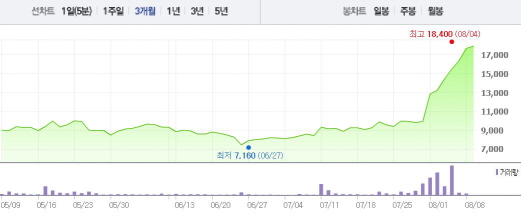 이는 1달 전 주가인 7월8일(8420원)과 비교했을 때 113% 상승한 수치다.