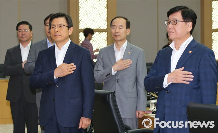 (세종=포커스뉴스) 황교안(오른쪽 세 번째) 국무총리가 9일 오전 세종시 정부세종청사 국무회의장에서 서울-세종 영상회의로 열린 국무회의에 참석해 국기에 대한 경례를 하고 있다.