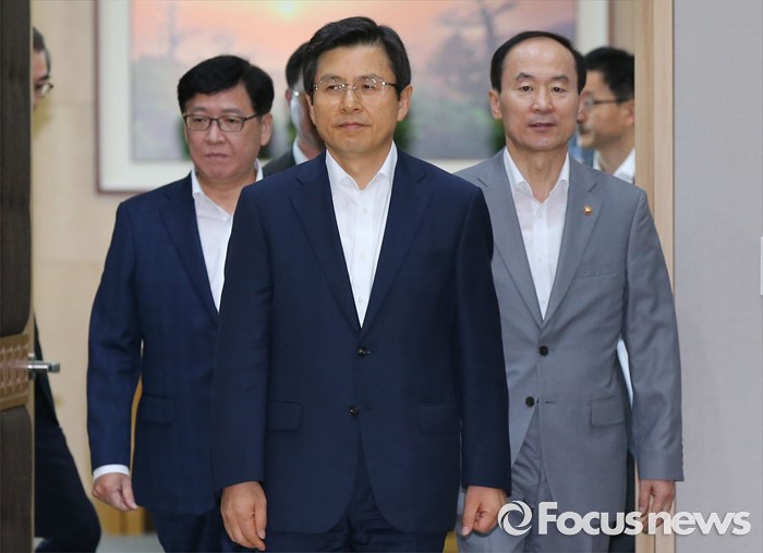 (세종=포커스뉴스) 황교안 국무총리가 9일 오전 세종시 정부세종청사 국무회의장에서 서울-세종 영상회의로 열린 국무회의에 입장하고 있다. 오른쪽부터 윤성규 환경부장관, 황 총리, 정진엽 보건복지부장관.