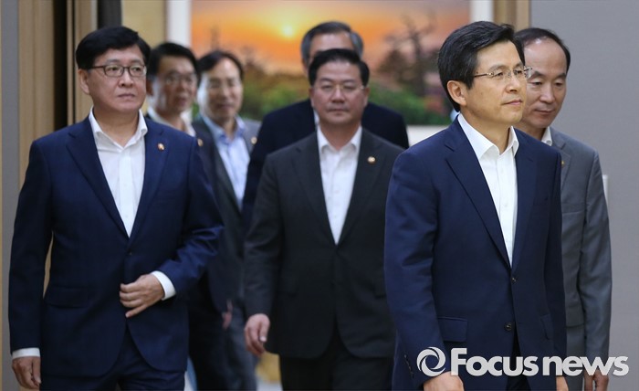 (세종=포커스뉴스) 황교안(오른쪽 두 번째) 국무총리가 9일 오전 세종시 정부세종청사 국무회의장에서 서울-세종 영상회의로 열린 국무회의에 입장하고 있다.