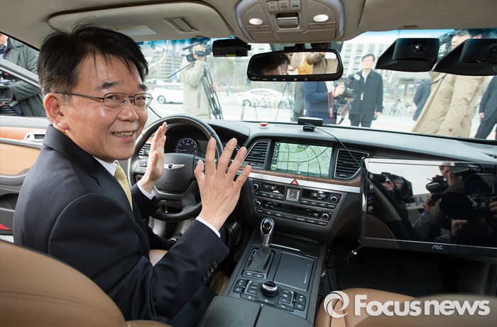 김용석 국토부 자동차관리관은 ” 특히 민간과 협력해 실험도시를 효과적으로 활용한다면 앞으로 자율주행차 기술개발과 산업육성에도 큰 효과가 있을 것으로 기대한다”고 말했다.(세종=포커스뉴스) 7일 오전 세종시 정부세종청사 국토교통부 앞에서제1호 자율주행차 시험운행 허가 및 시연이 열린 가운데 현대 제네시스가 국내 자율주행차 임시운행 제1호차로 허가받고 도로주행을 시작했다. 강호인 국토교통부장관이 시범운행차량을 시승하고 있다. 2016.03.07 김기태 기자