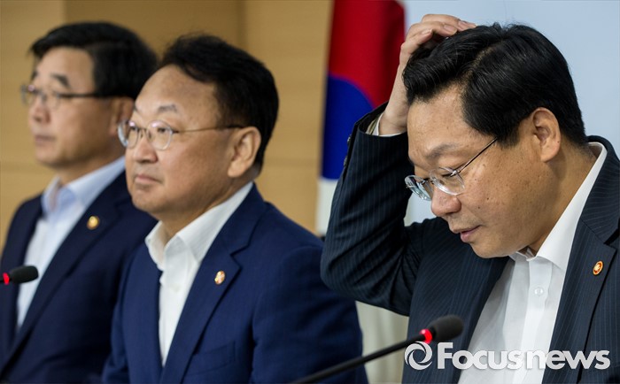 (서울=포커스뉴스) 9일 오전 정부서울청사에서 열린 '2016년 추경예산안 국회 조기통과' 관련 합동브리핑에 참석한 주형환(맨 오른쪽) 산업통상자원부 장관이 머리카락을 쓸어넘기고 있다.