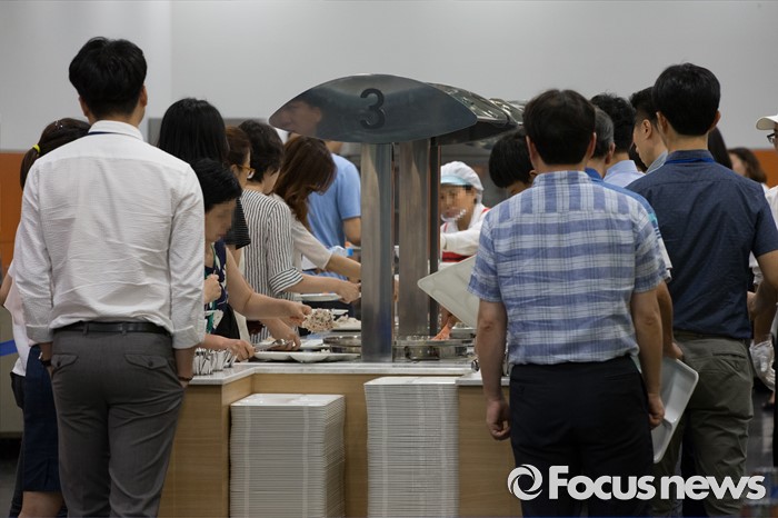 (서울=포커스뉴스) 수도권 대부분 지역에 엿새째 폭염경보가 내려진 9일 오전 서울 중구 한 구내식당이 직원들로 붐비고 있다.