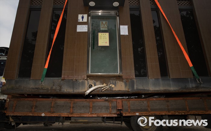 (남양주=포커스뉴스) 9일 오전 경기 남양주 봉주르 카페 내 건축법 제11조 등 3건의 위반 건축물이 대형 트럭에 옮겨져 있다.