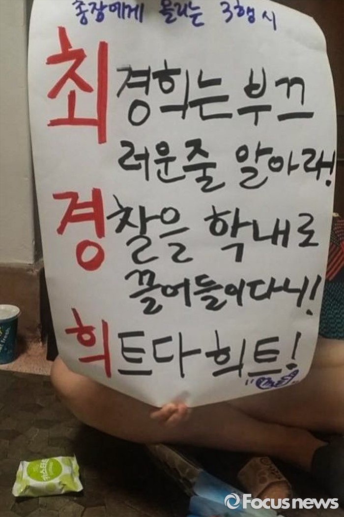 (서울=포커스뉴스) 9일 오전 서울 마포구 이화여대에서 최경희 총장 사퇴를 요구하며 농성을 벌이고 있는 본관 내부 모습이 공개됐다. 한 학생이 최경희 총장을 비난하는 글귀를 들고 있다.<사진제공=이화여대언론팀>
