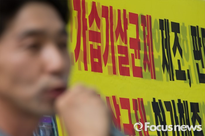 (서울=포커스뉴스) 9일 오후 서울 영등포구 옥시 한국 본사 앞에서 가습기 살균제 피해자와 유가족들이 옥시 최종배상안 철회와 상세한 수사를 촉구하며 기자회견을 하고 있다.