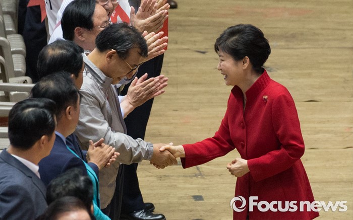 (서울=포커스뉴스) 박근혜 대통령이 9일 오후 서울 송파구 잠실실내체육관에서 제4차 새누리당 전당대회에 입장하며 이정현 후보와 악수를 하고 있다.