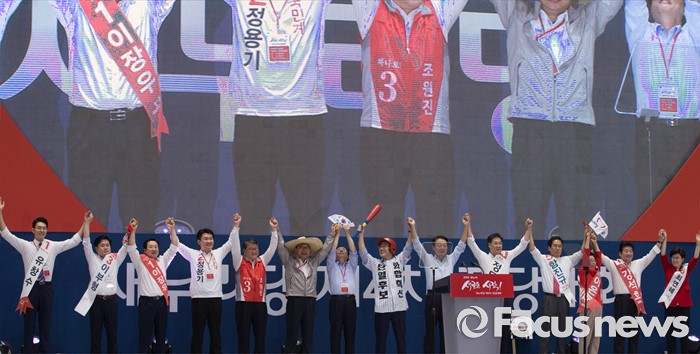 (서울=포커스뉴스) 9일 오후 서울 송파구 잠실실내체육관에서 열린 새누리당 4차 전당대회에 참석한 당대표 및 최고위원 후보들이 손을 들어 인사하고 있다.