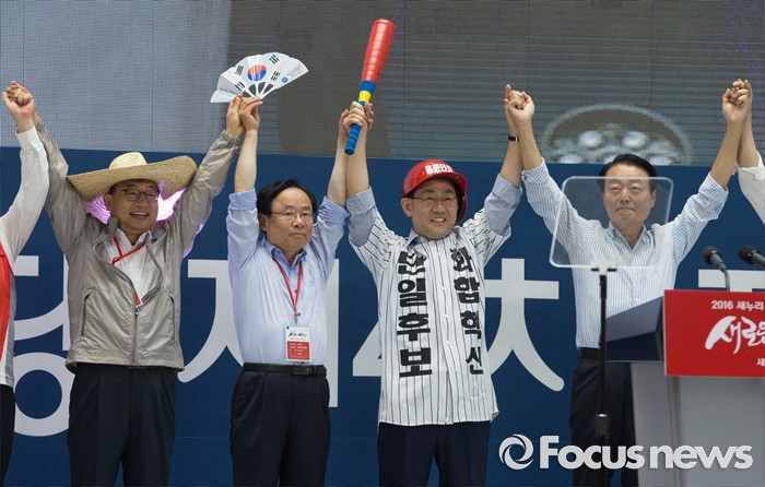 (서울=포커스뉴스) 9일 오후 서울 송파구 잠실실내체육관에서 열린 새누리당 4차 전당대회에 참석한 이정현(왼쪽부터), 이주영, 주호영, 한선교 당대표 후보가 손을 들어 인사하고 있다.