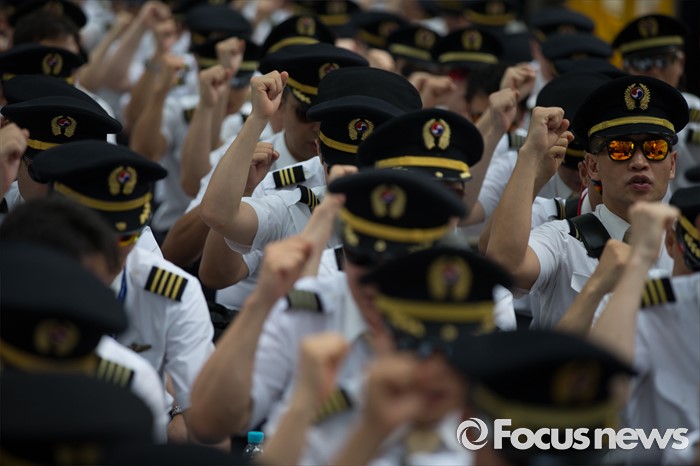 (서울=포커스뉴스) 9일 오후 서울 종로구 서울지방국세청 앞에서 열린 대한항공 경영정상화를 위한 세무조사 촉구대회에서 대한항공 조종사 노동조합 조합원들이 구호를 외치고 있다.