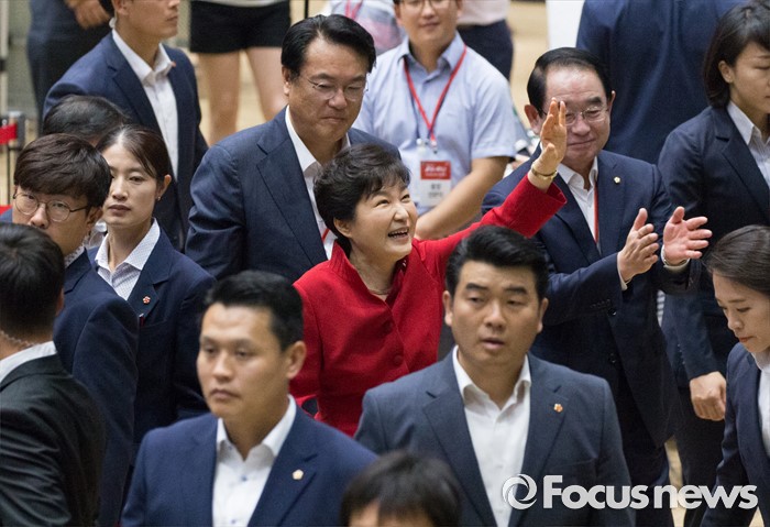 (서울=포커스뉴스) 박근혜 대통령이 9일 오후 서울 송파구 잠실실내체육관에서 제4차 새누리당 전당대회에 참석해 축사를 마치고 당원들에게 인사를 하고 있다.