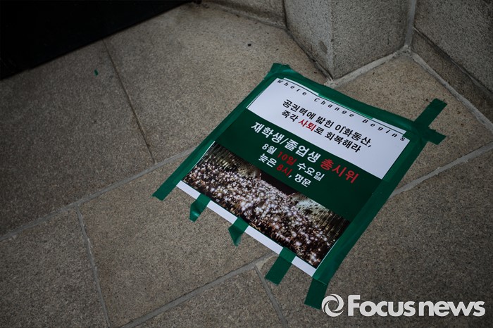 (서울=포커스뉴스) 이화여자대학교 최경희 총장이 학생들이 요구한 '9일 오후 3시까지 사퇴'를 거부한 9일 오후 서울 마포구 이화여자대학교 본관 앞에 재학생 및 졸업생 총시위를 알리는 포스터가 바닥에 붙어있다.