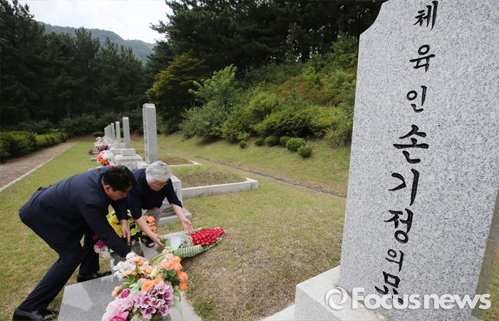 (대전=포커스뉴스) 9일 오후 대전 유성구 국립대전현충원 국가사회공헌자묘역에서 베를린 올림픽 마라톤 금메달리스트 손기정 선수의 딸 손문영 여사와 외손주인 이준승 손기정기념재단 사무총장이 손기정 선수 묘소에 80송이의 장미꽃을 헌화하고 있다. 손기정 선수는 80년 전인 1936년 8월 9일 베를린 올림픽 마라톤에서 금메달을 목에 걸었다.