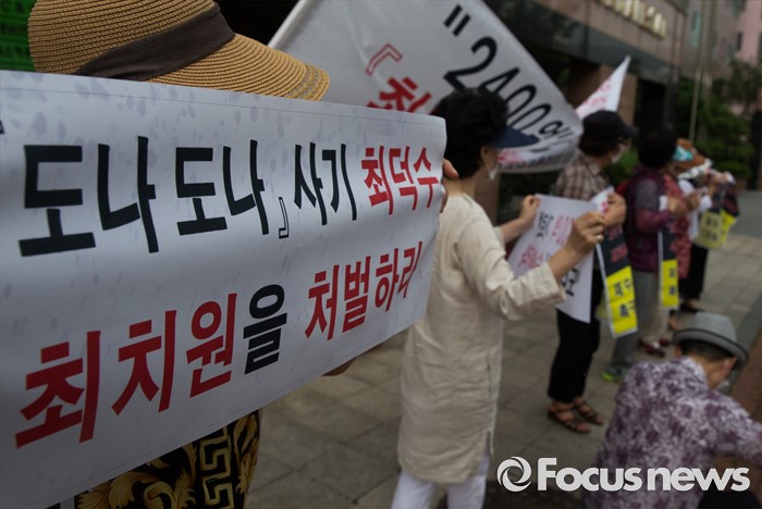 (서울=포커스뉴스) 9일 오후 서울 서초구 서초역 앞에서 도나도나 피해자 모임 관계자들이 '도나도나 돼지분양 사기사건' 재수사를 촉구하는 손피켓을 들고 있다.