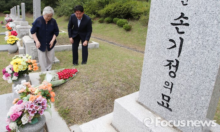 (대전=포커스뉴스) 9일 오후 대전 유성구 국립대전현충원 국가사회공헌자묘역에서 베를린 올림픽 마라톤 금메달리스트 손기정 선수의 딸 손문영 여사와 외손주인 이준승 손기정기념재단 사무총장이 손기정 선수 묘소에 헌화하고 묘역을 둘러보고 있다. 손기정 선수는 80년 전인 1936년 8월 9일 베를린 올림픽 마라톤에서 금메달을 목에 걸었다.