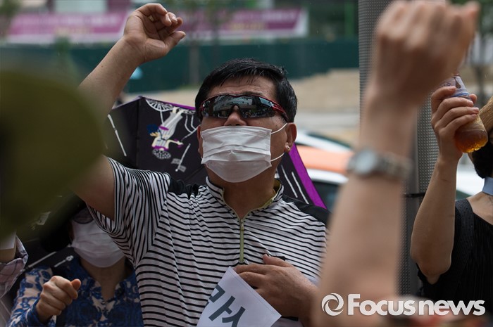 (서울=포커스뉴스) 9일 오후 서울 서초구 서초역 앞에서 도나도나 피해자 모임 관계자들이 '도나도나 돼지분양 사기사건' 재수사를 촉구하는 구호를 외치고 있다.
