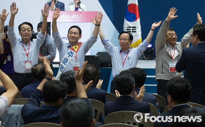 (서울=포커스뉴스) 9일 오후 서울 송파구 잠실실내체육관에서 열린 새누리당 4차 전당대회에 참석한 당대표 후보 들이 정견발표를 마친 뒤 당원들에게 인사하고 있다. 왼쪽부터 한선교, 주호영, 이주영, 이정현 후보.