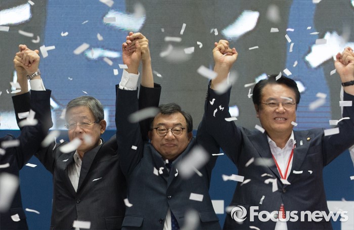 (서울=포커스뉴스) 9일 오후 서울 송파구 잠실실내체육관에서 열린 새누리당 4차 전당대회에 참석한 이정현(가운데) 의원이 당대표로 선출된 후 김희옥(왼쪽) 혁신비대위원장, 정진석 원내대표 등과 손을 들어 인사하고 있다.