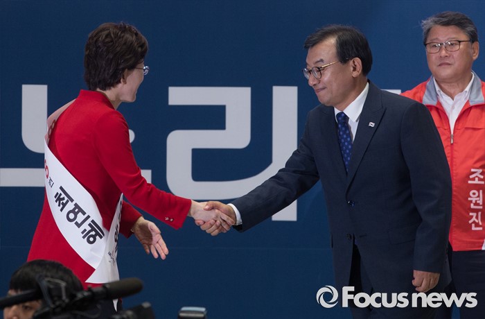 (서울=포커스뉴스) 9일 오후 서울 송파구 잠실실내체육관에서 열린 새누리당 4차 전당대회에서 당대표로 선출된 이정현(가운데) 의원이 최고위원으로 선출된 최연혜(왼쪽), 조원진 의원과 인사하고 있다.
