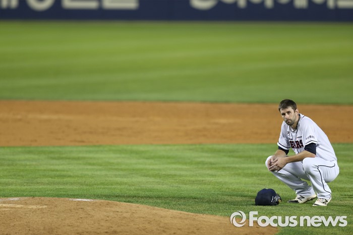 (서울=포커스뉴스) 9일 서울 잠실구장에서 열린 2016 프로야구 KIA-두산 경기 4회초 김풍기 주심의 건강이상으로 주심교체를 위해 경기가 잠시 중단되자 두산 투수 니퍼트가 그라운드에 쪼그려 앉아 기다리고 있다.