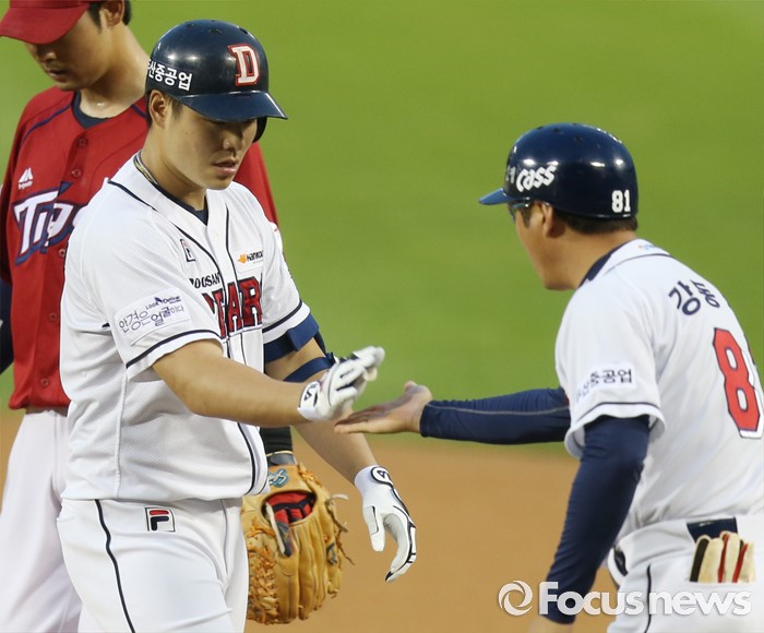 (서울=포커스뉴스) 9일 서울 잠실구장에서 열린 2016 프로야구 KIA-두산 경기 2회말 1사 만루에서 두산 민병헌이 2타점 적시타를 치고 1루에서 강동우 코치의 축하를 받고 있다.