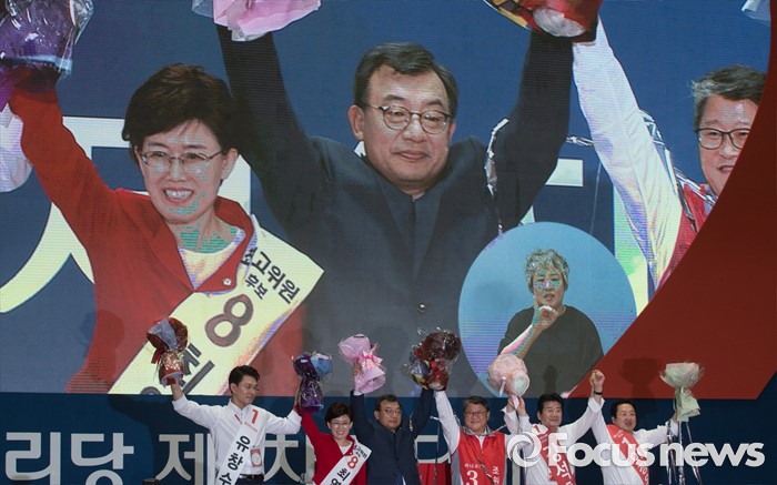 (서울=포커스뉴스) 9일 오후 서울 송파구 잠실실내체육관에서 열린 새누리당 4차 전당대회에서 당대표로 선출된 이정현 의원과 신임 최고위원들이 손을 들어 인사하고 있다. 왼쪽부터 유창수, 최연혜 신임 최고위원, 이정현 신임 대표, 조원진, 강석호, 이장우 신임 최고위원.