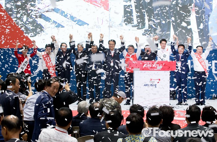 (서울=포커스뉴스) 9일 오후 서울 송파구 잠실실내체육관에서 열린 새누리당 4차 전당대회에서 신임 당대표로 선출된 이정현 의원과 김희옥 혁신비대위원장, 정진석 원내대표 등 지도부가 손을 들어 인사하고 있다.