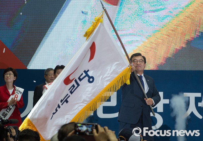 (서울=포커스뉴스) 9일 오후 서울 송파구 잠실실내체육관에서 열린 새누리당 4차 전당대회에서 신임 당대표로 선출된 이정현 의원이 당기를 흔들고 있다.