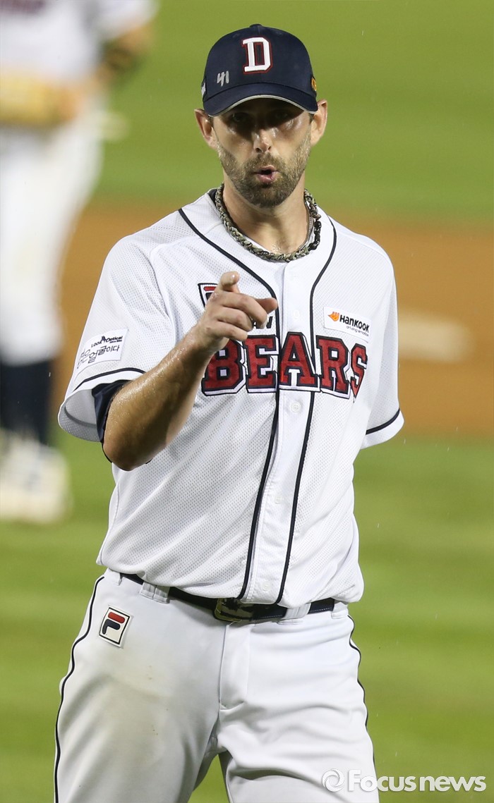 (서울=포커스뉴스) 9일 서울 잠실구장에서 열린 2016 프로야구 KIA-두산 경기 6회초 두산 투수 니퍼트가 KIA 이범호를 3루 땅볼로 잡고 이닝을 마치며 포수 양의지를 향해 격려의 사인을 보내고 있다.