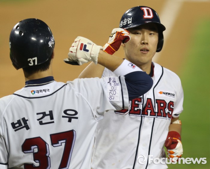 (서울=포커스뉴스) 9일 서울 잠실구장에서 열린 2016 프로야구 KIA-두산 경기 7회말 2사 1,2루에서 두산 허경민이 좌월 3점 홈런을 치고 선행주자 박건우의 환영을 받으며 홈인하고 있다.