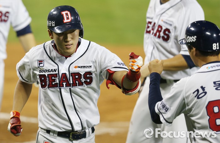 | △ 3점 홈런치고 홈인하는 두산 허경민 |