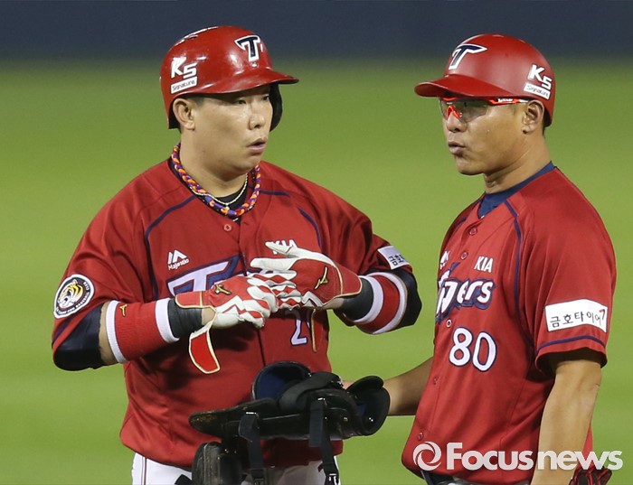 (서울=포커스뉴스) 9일 서울 잠실구장에서 열린 2016 프로야구 KIA-두산 경기 8회초 1사 2,3루에서 KIA 나지완이 우익수 오른쪽에 떨어지는 2타점 2루타를 치고 2루에서 김창희 코치와 대화하고 있다.
