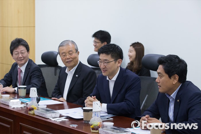 (서울=포커스뉴스) 10일 오전 서울 여의도 국회 의원회관에서 열린 '어젠다(Agenda) 2050' 회의에 참석한 의원들이 논의하고 있다. 왼쪽부터 유승민 새누리당 의원, 김종인 더불어민주당 비대위 대표, 김세연, 오신환 새누리당 의원.