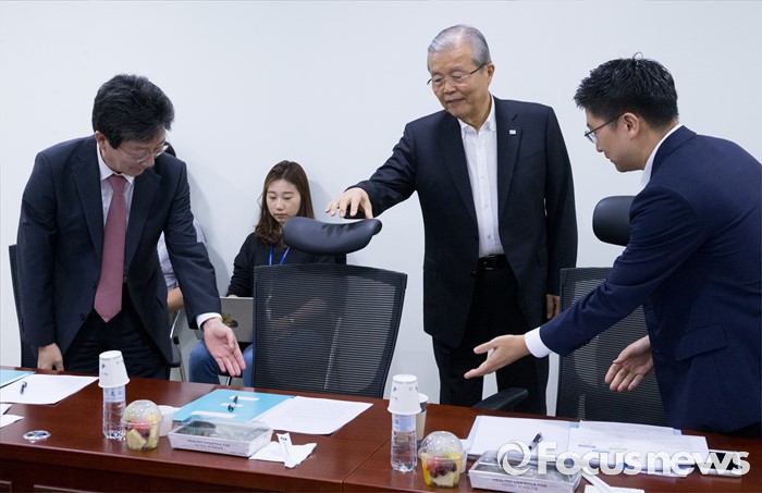 (서울=포커스뉴스) 10일 오전 서울 여의도 국회 의원회관에서 열린 '어젠다(Agenda) 2050' 회의에 참석한 유승민(왼쪽), 김세연(오른쪽) 새누리당 의원이 김종인 더불어민주당 비대위 대표에게 자리를 안내하고 있다.
